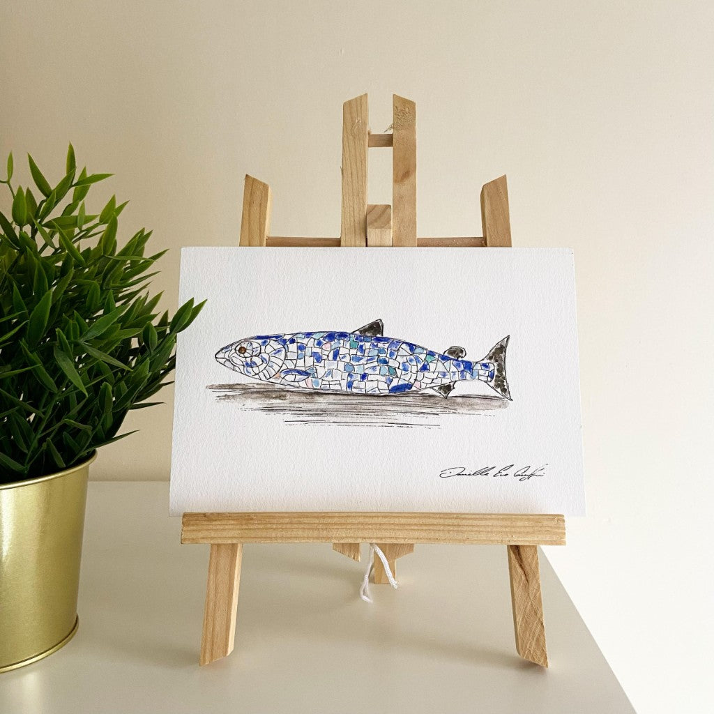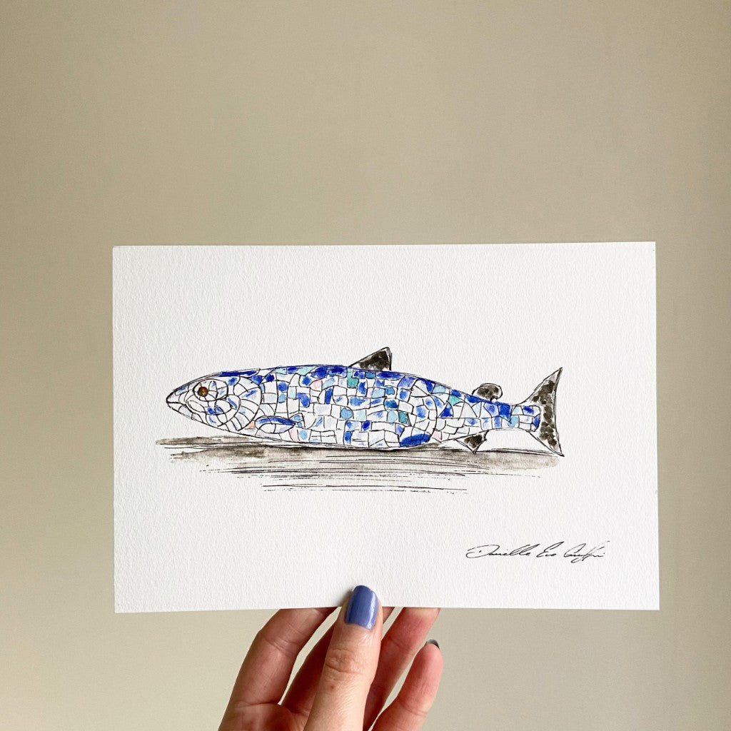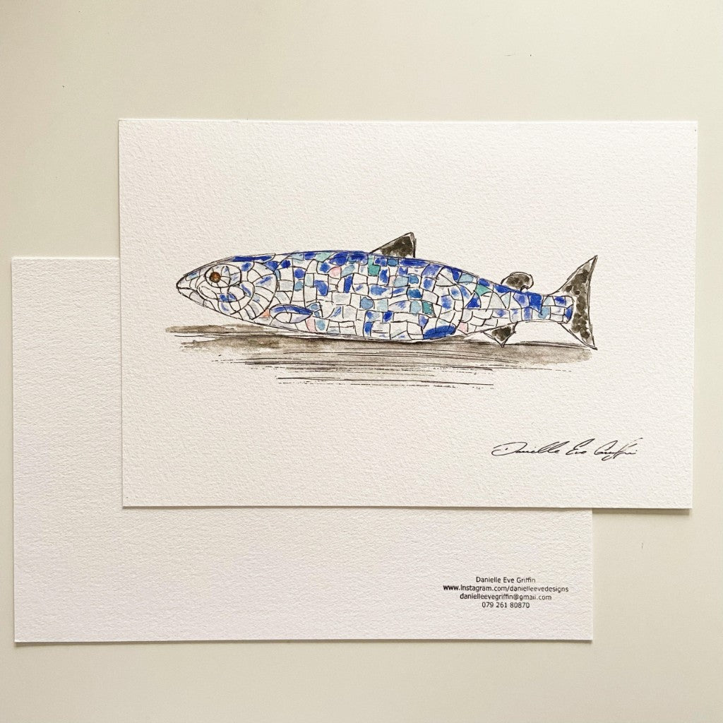 Combining watercolour and ink, this ‘Big Fish’ Giclee print is from Danielle’s NI Landmarks collection. Otherwise known as the 'Salmon of Knowledge’, this landmark can be found at Donegall Quay in Belfast and celebrates the regeneration of the River Lagan.