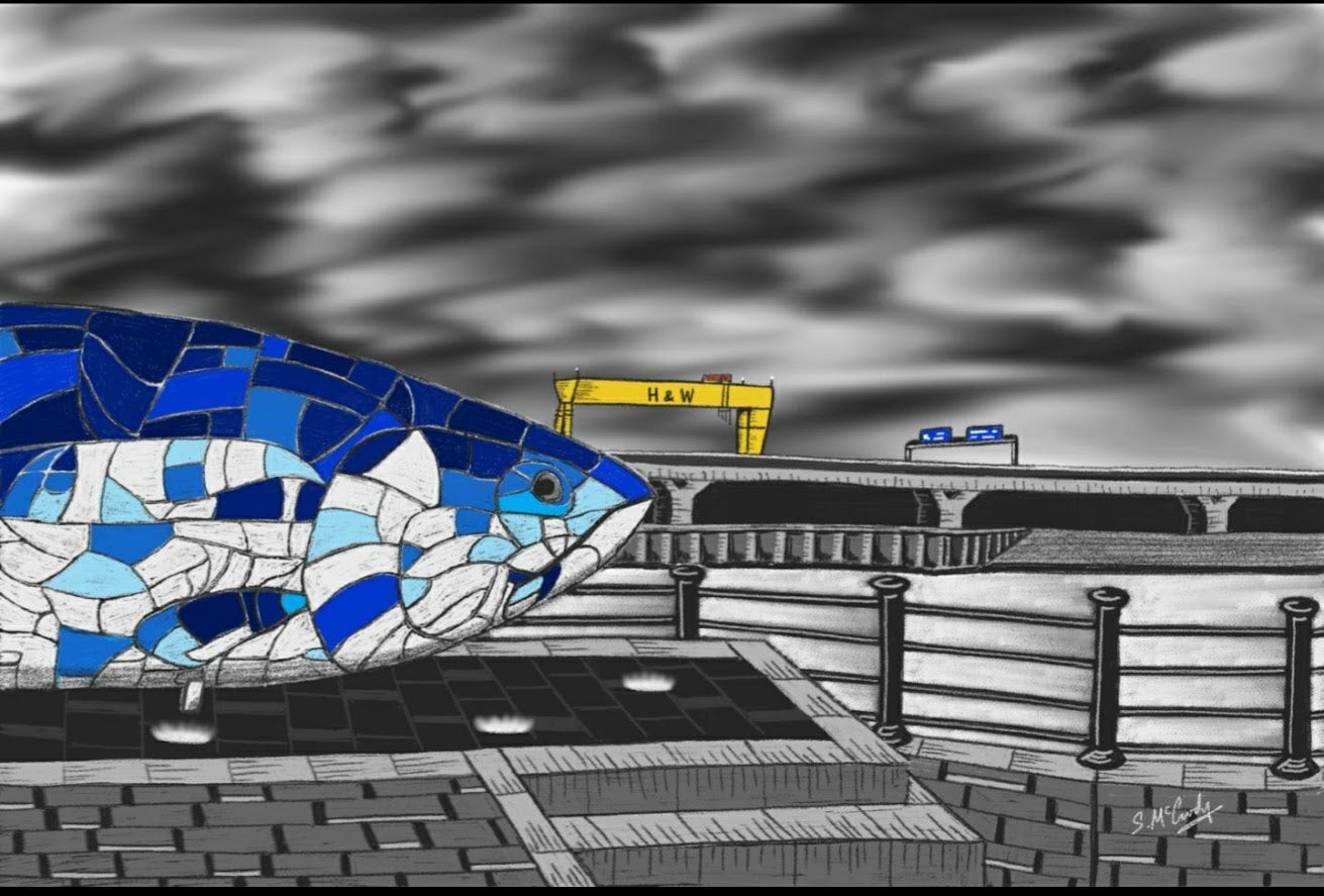 An atmospheric and stormy image of two of Belfast’s famous landmarks, the Salmon of Knowledge and the mighty Harland and Wolff Cranes.