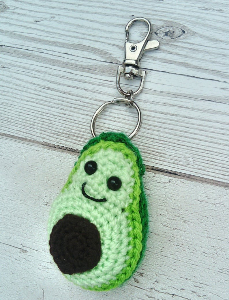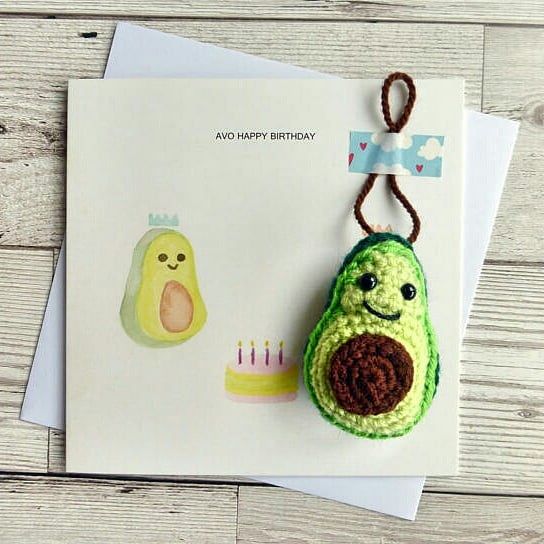 A fun watercolour avocado themed birthday card with a cheeky smiley crocheted avocado keyring or hanging hoop attached. Crocheted amigurumi avocado is made with eco-friendly vegan materials - cotton and recycled cotton stuffing, and would make a great gift for animal lovers and those interested in a plant based lifestyle. Avocado decoration measures 7.5cm length approx, 6cm width approx at widest part, 3cm depth approx.
