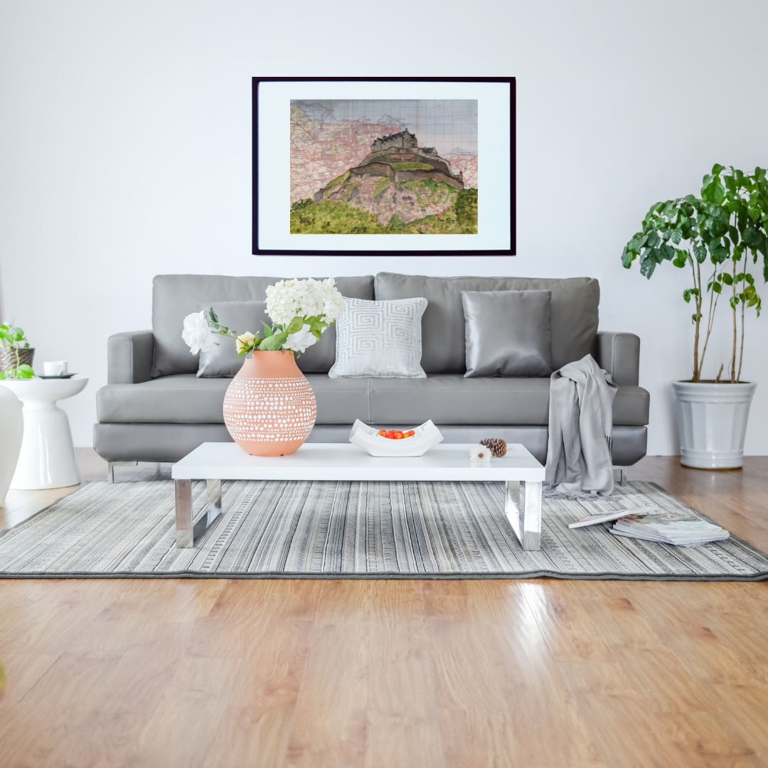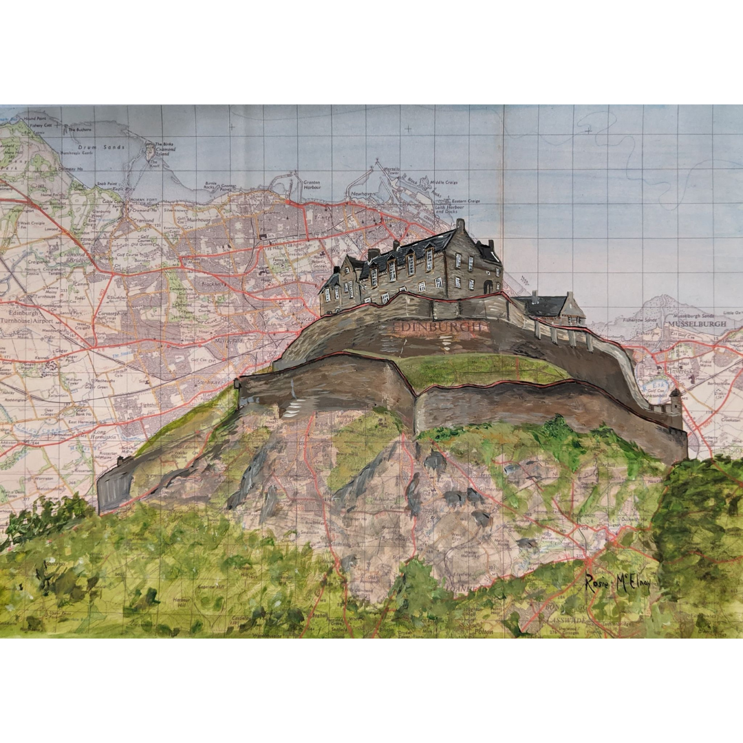 This wonderful painting of Edinburgh Castle, which sits high upon the mighty Castle Rock, was created with acrylic paints using a map of the area as the canvas. The twists and turns of the map have been lovingly woven into the painting of the castle and surrounding landscape.