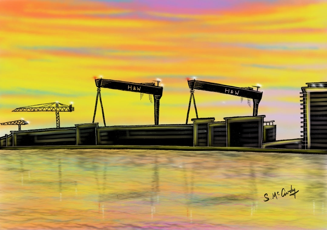 Stunning skies and the mighty cranes which dominate the Belfast skyline feature in this newest work from Stephen.