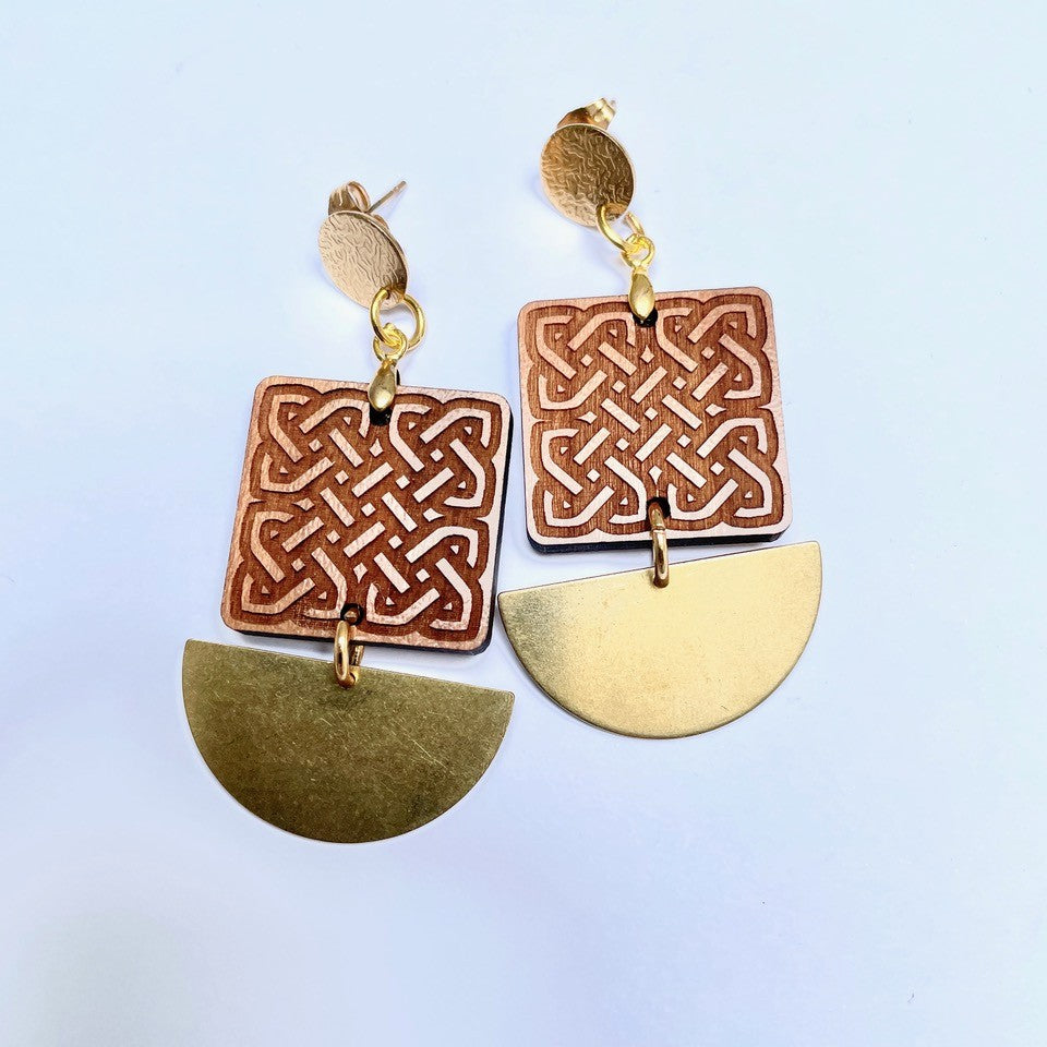 Golden Brass and Cherry Wood Engraved Earrings