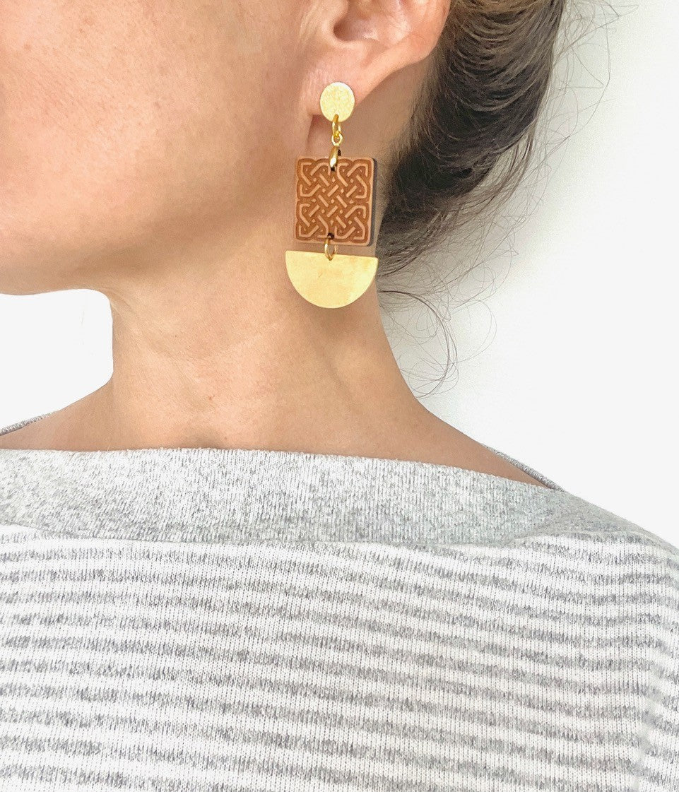 Maggie from Mothu is inspired by ancient Celtic patterns and the merging of traditional patterns. These contemporary earrings combine elements of medieval engraving, rich golden brass and hand finished detail.