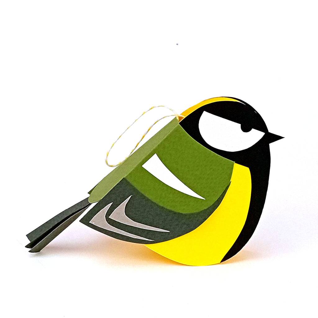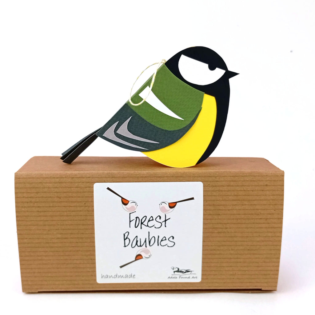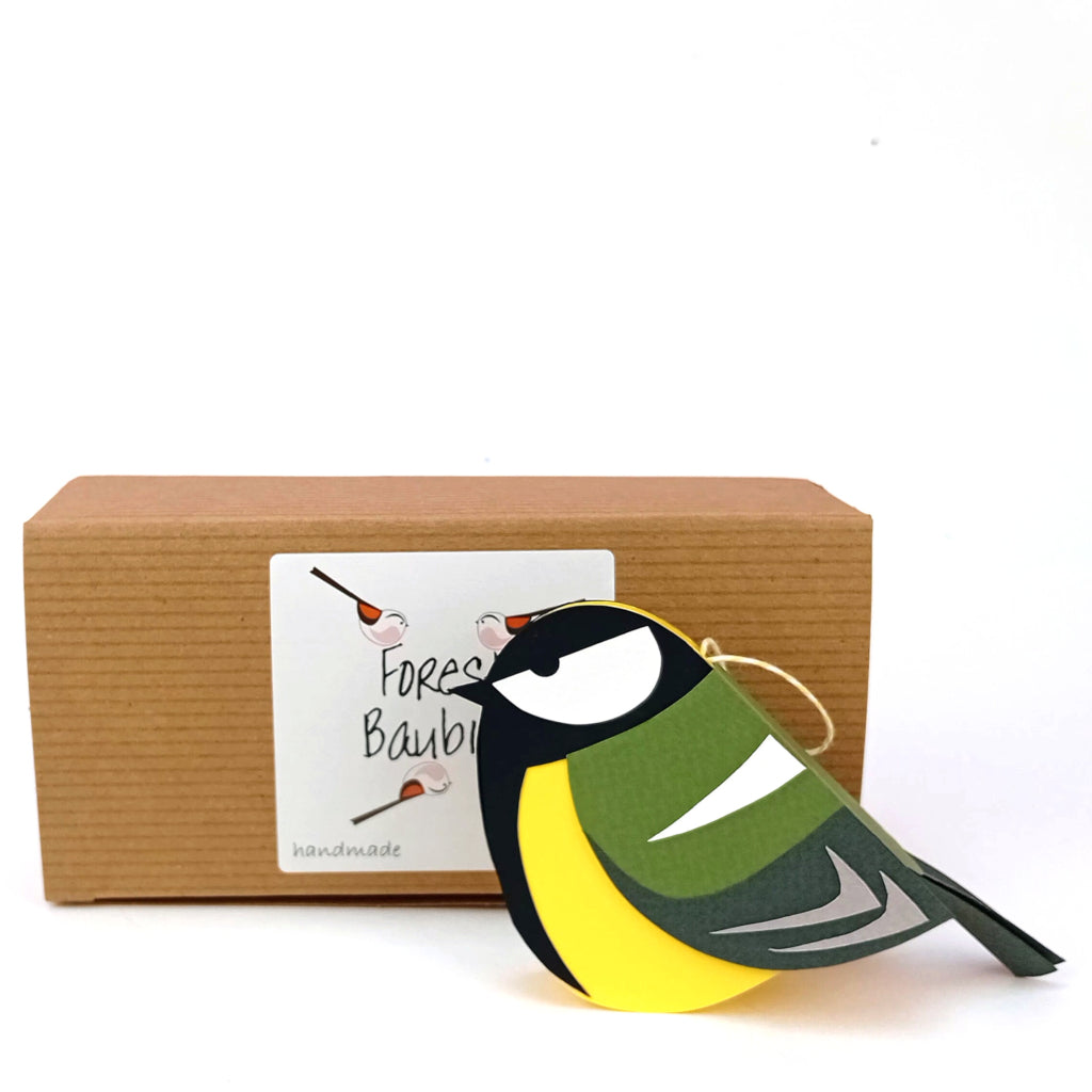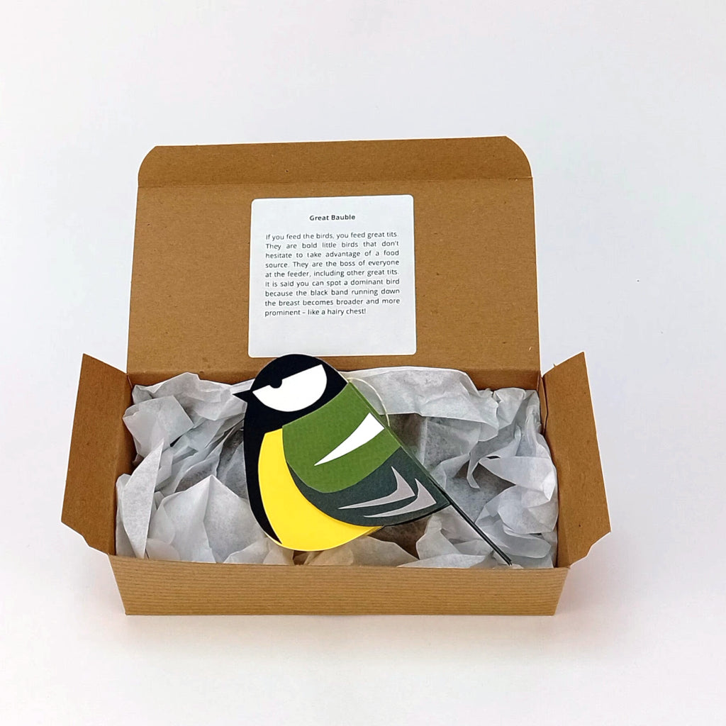 A handmade paper Great tit nestled on tissue paper in a gift box. The bird is approximately 8cm tall x 12cm long and the box is 177mm x 85mm x 50mm.