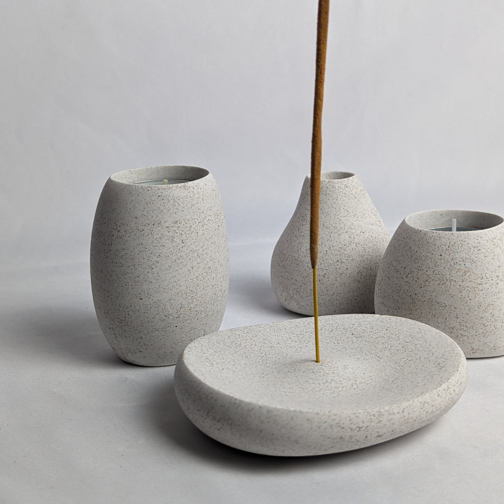 Skwid Studio's pieces are cast using an eco-friendly resin called Jesmonite. They are inspired by natural forms with a textured, weighted finish. The contemporary designs fit seamlessly into any space.