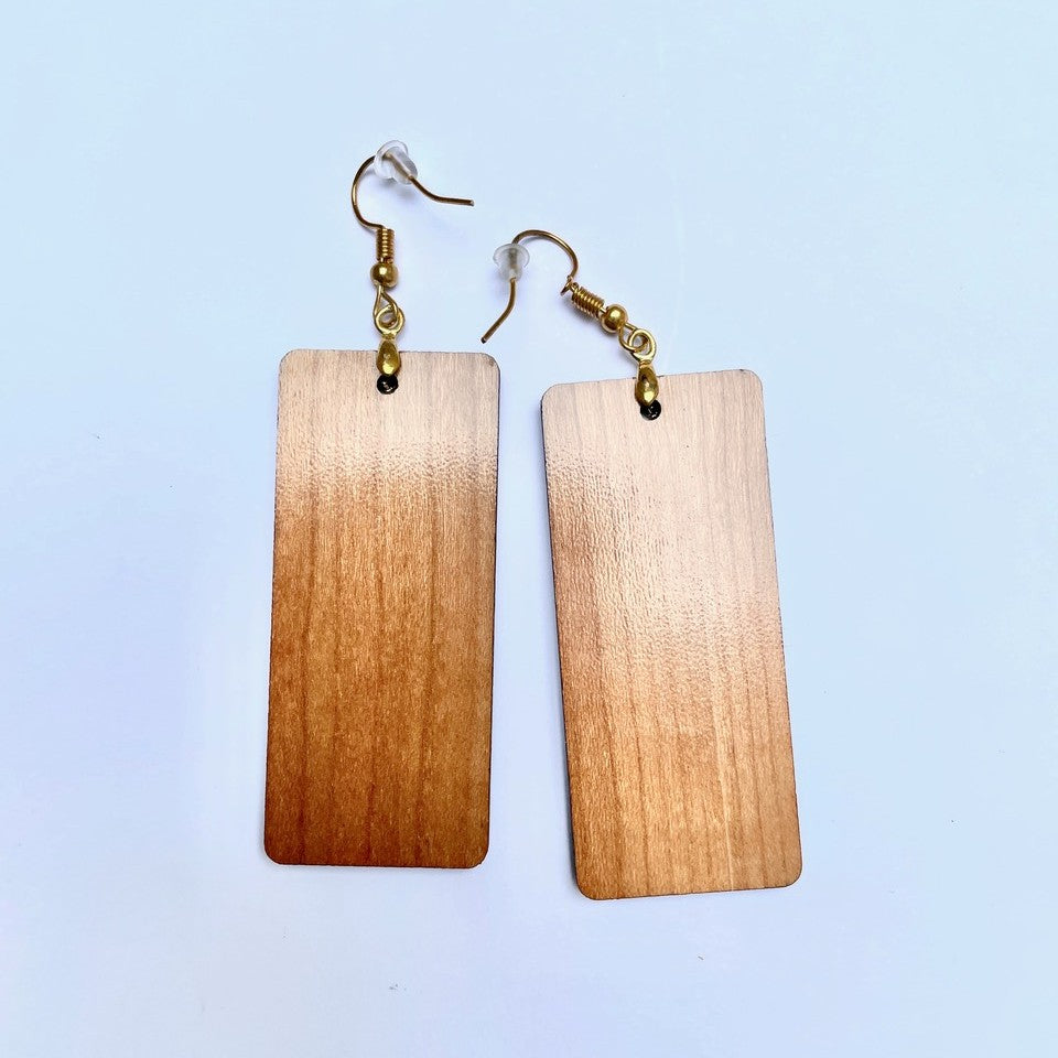 Materials: cherry wood and sterling silver ear attachment. Dimensions: 6.5cm x 6cm x 0.3cm.