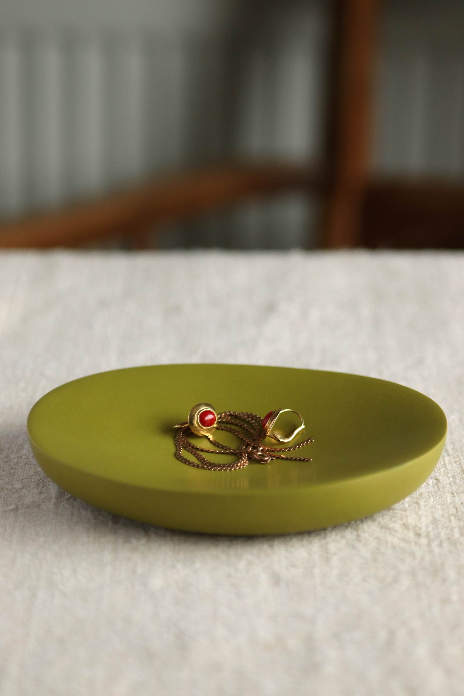 This handmade Trinket Dish, while serving a similar purpose to the Trinket Bowl, boasts a distinct design. Its lower profile allows for easy stacking and makes it an attractive display piece for showcasing precious pieces.