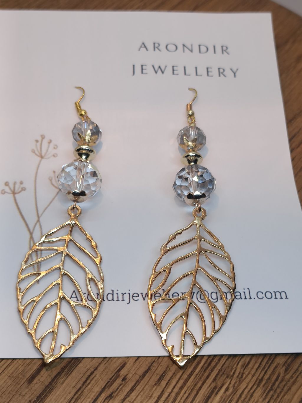 Above each leaf hangs a pair of faceted glass beads that catch the light beautifully, adding a touch of sparkle and sophistication. The beads are accented with small goldtone details, perfectly complementing the warm metallic hue of the leaves.