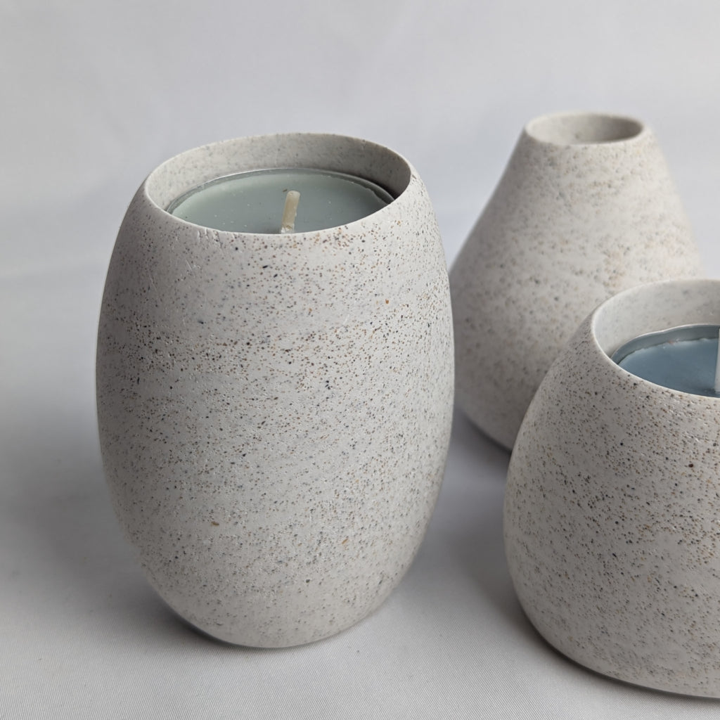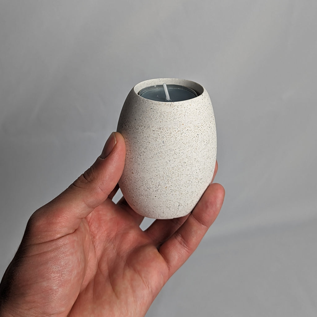 This handmade Tealight Holder is the largest of the three, with an oval form that conveys a weighted stonelike finish and monolithic design, enhancing its resemblance to a river or beach stone. This design element brings a sense of tranquility and timeless beauty, echoing the serene and enduring qualities of nature.