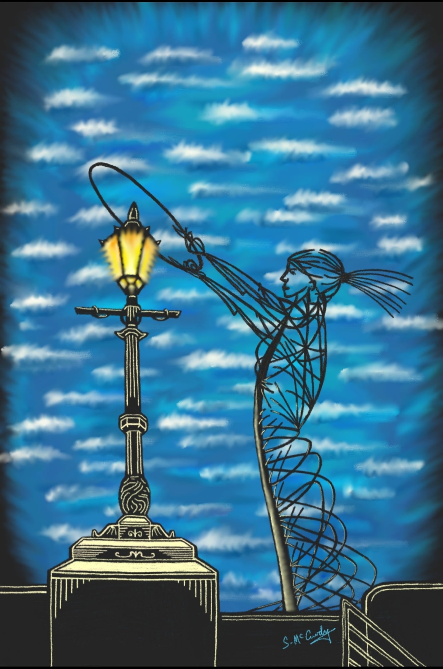 A unique interpretation of Belfast’s Beacon of Hope sculpture. This sculpture at Queen’s Bridge in Belfast, symbolises the period of change and regeneration that has occurred in the city’s Laganside area. Locally known as ‘Nuala with the Hula’ and ‘the doll with the ball’, the sculpture is the second largest public artwork in the city and Stephen has created this image in his signature style.