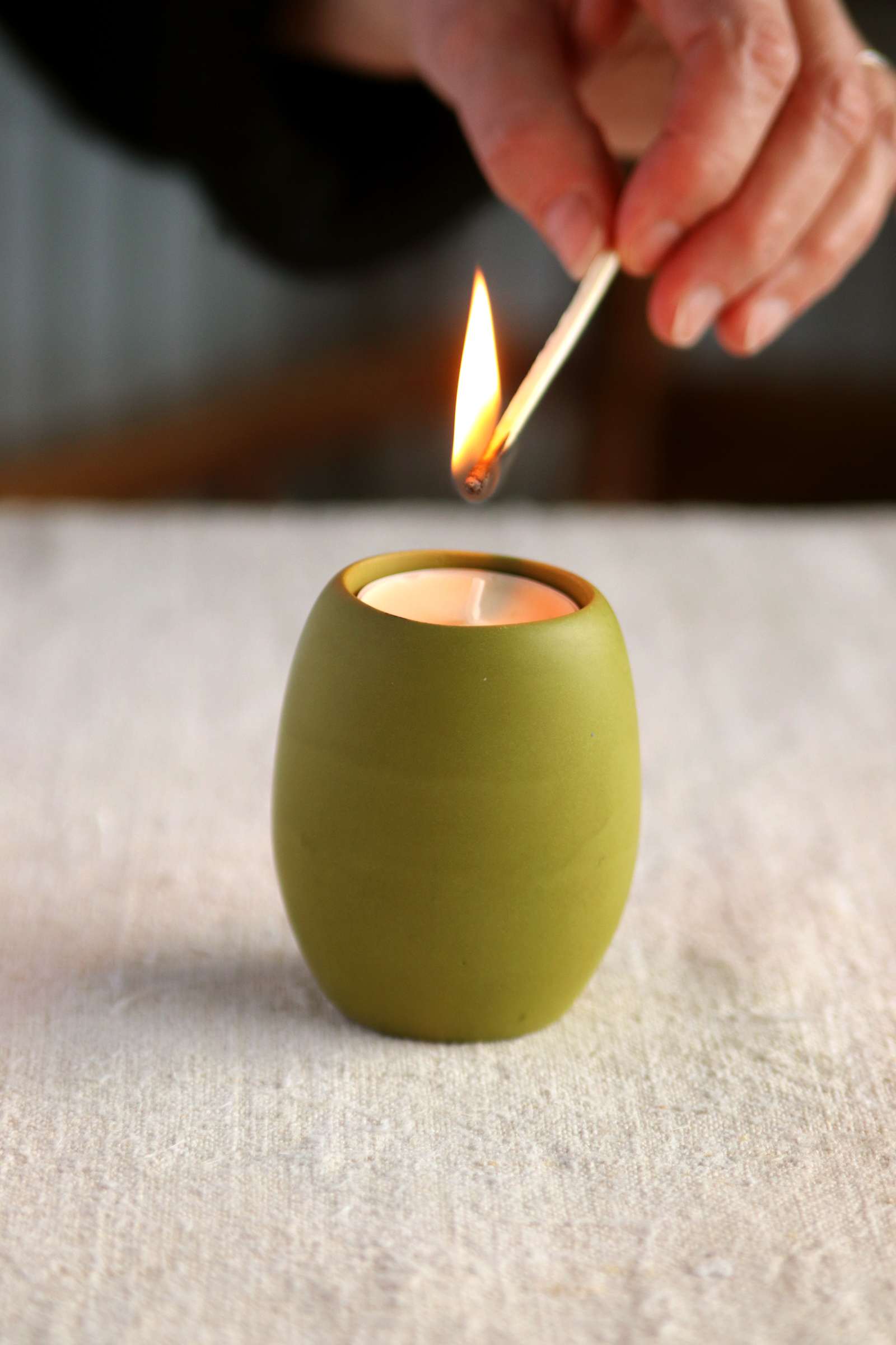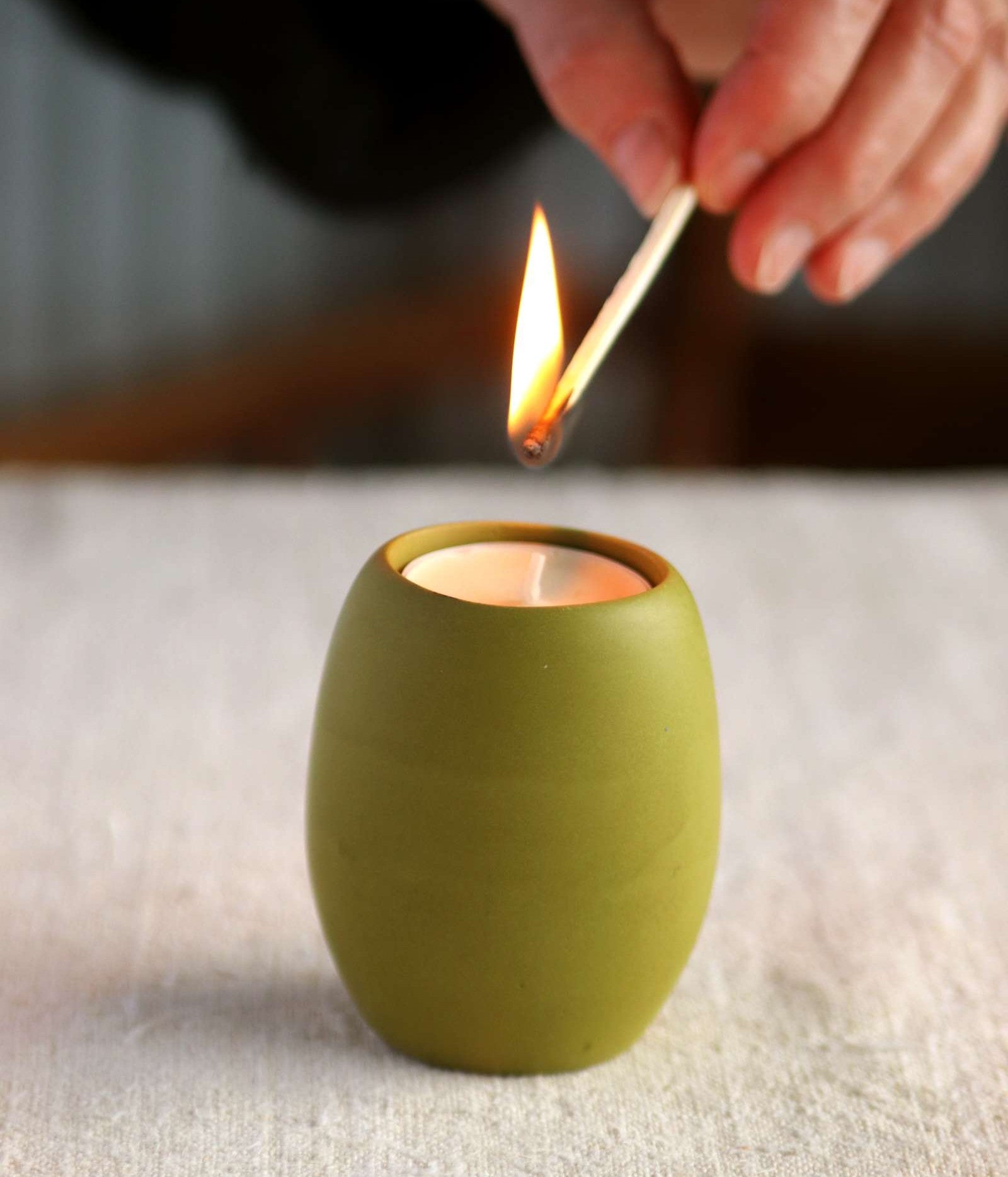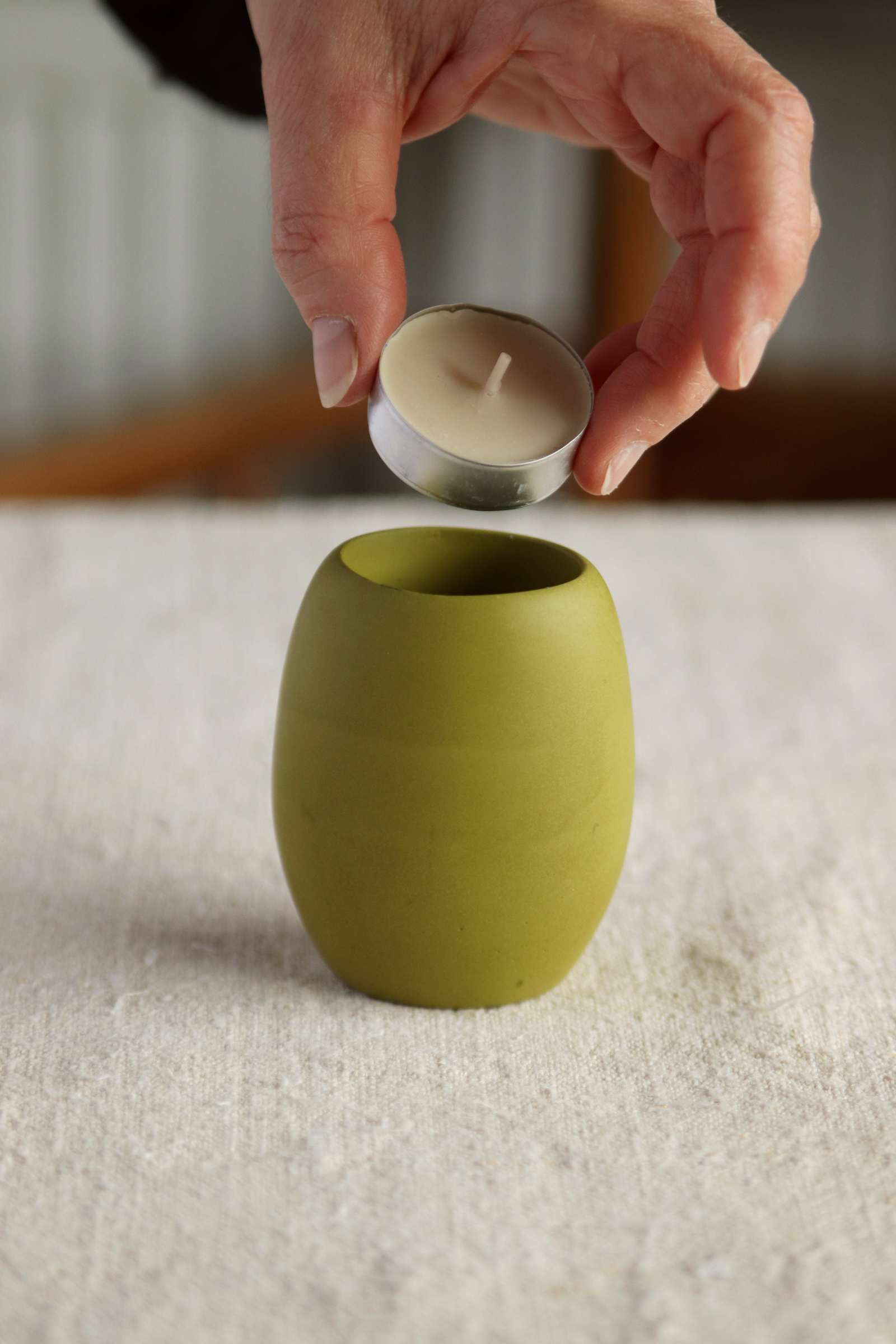 This handmade Tealight Holder is the largest of the three, with an oval form that conveys a weighted stonelike finish and monolithic design, enhancing its resemblance to a river or beach stone. This design element brings a sense of tranquility and timeless beauty, echoing the serene and enduring qualities of nature.