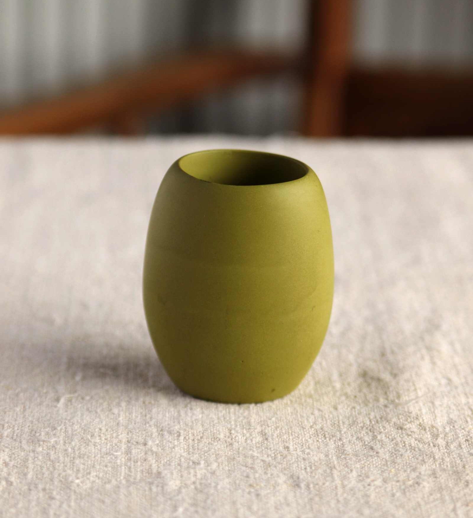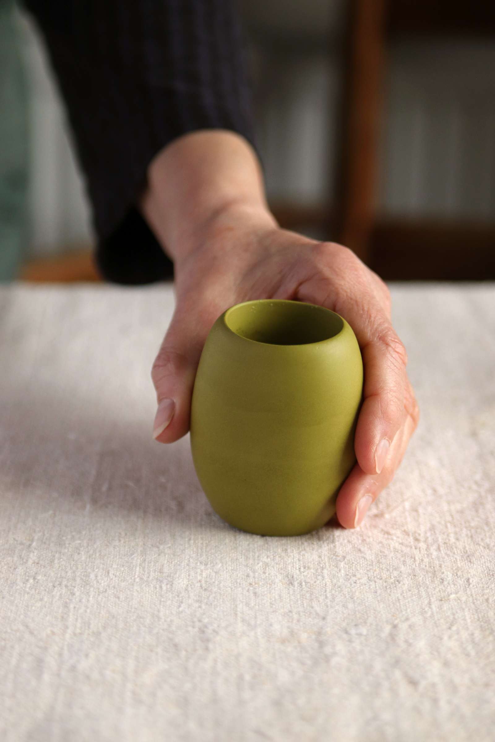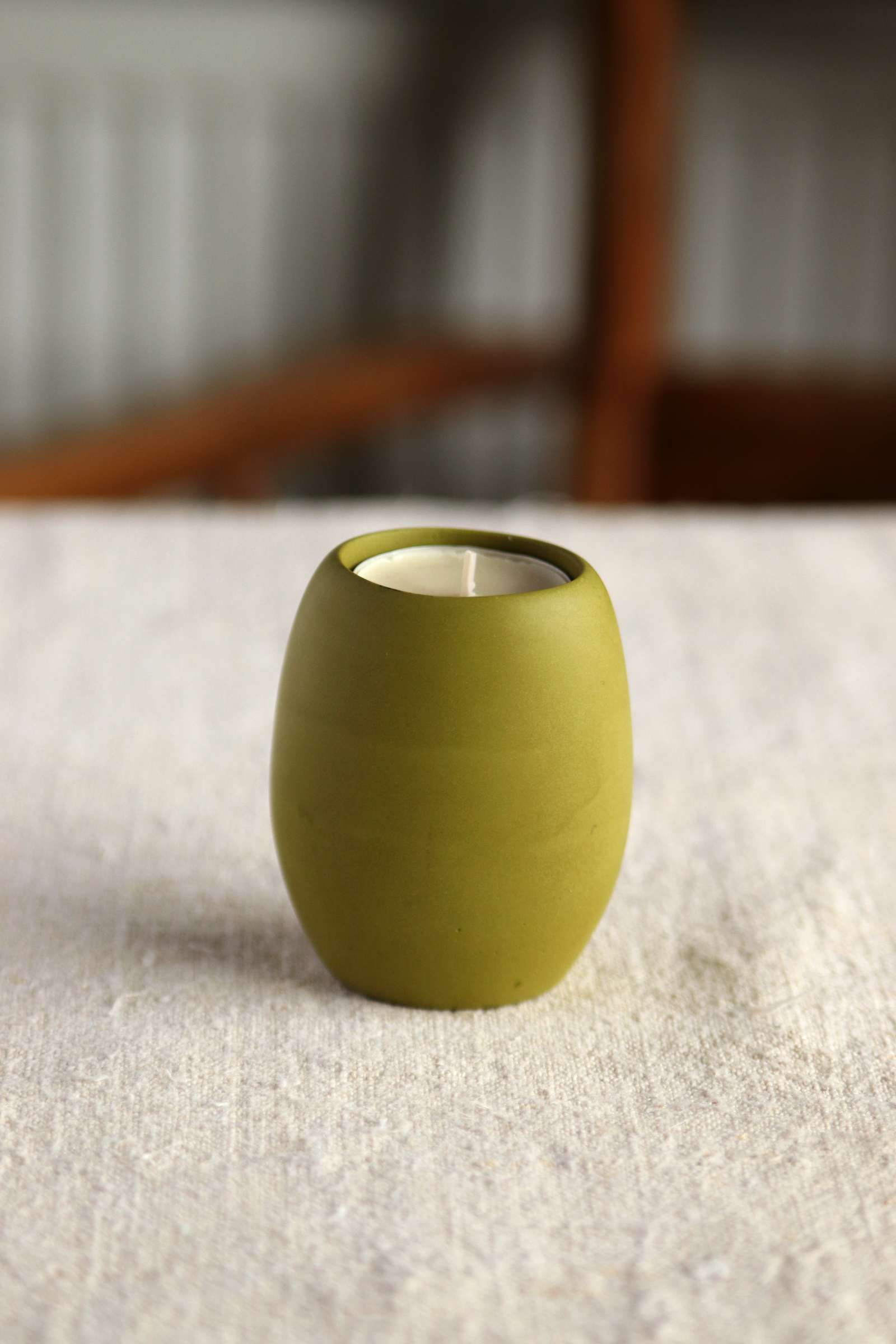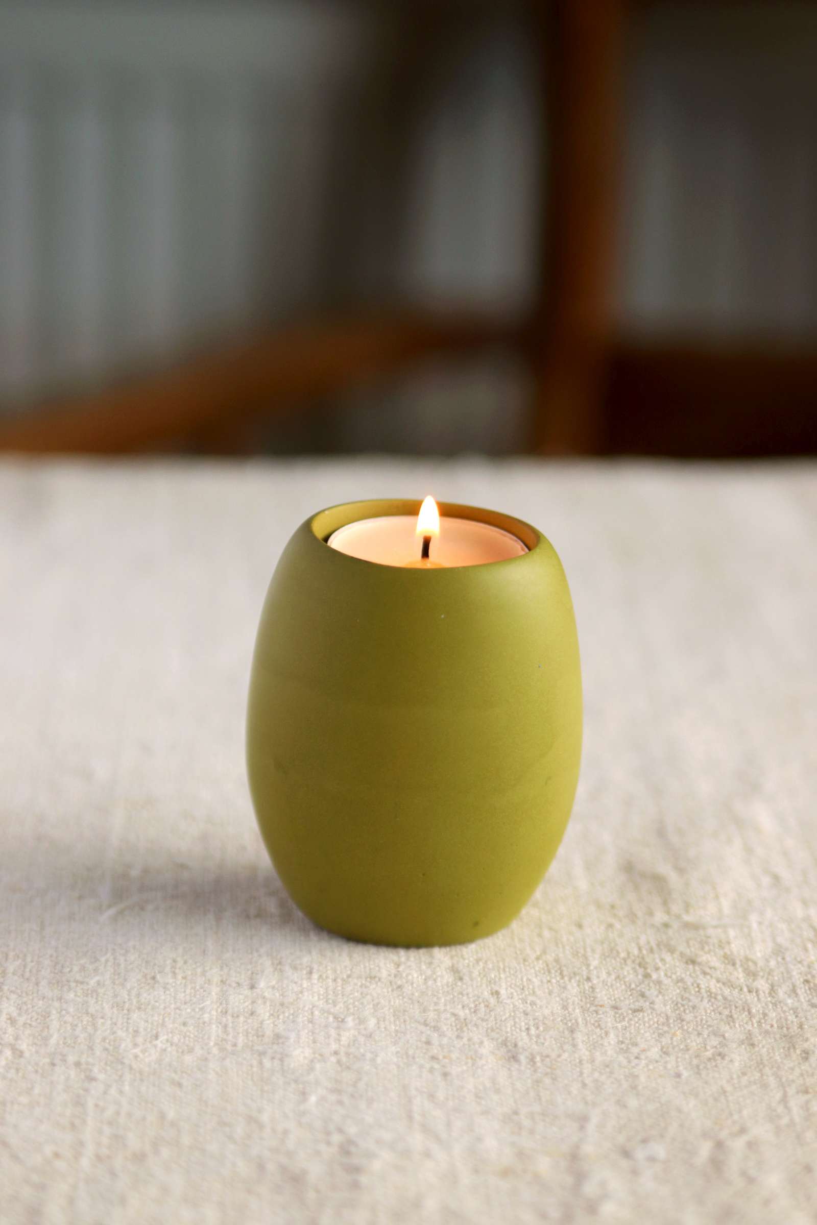 This handmade Tealight Holder is the largest of the three, with an oval form that conveys a weighted stonelike finish and monolithic design, enhancing its resemblance to a river or beach stone. This design element brings a sense of tranquility and timeless beauty, echoing the serene and enduring qualities of nature.