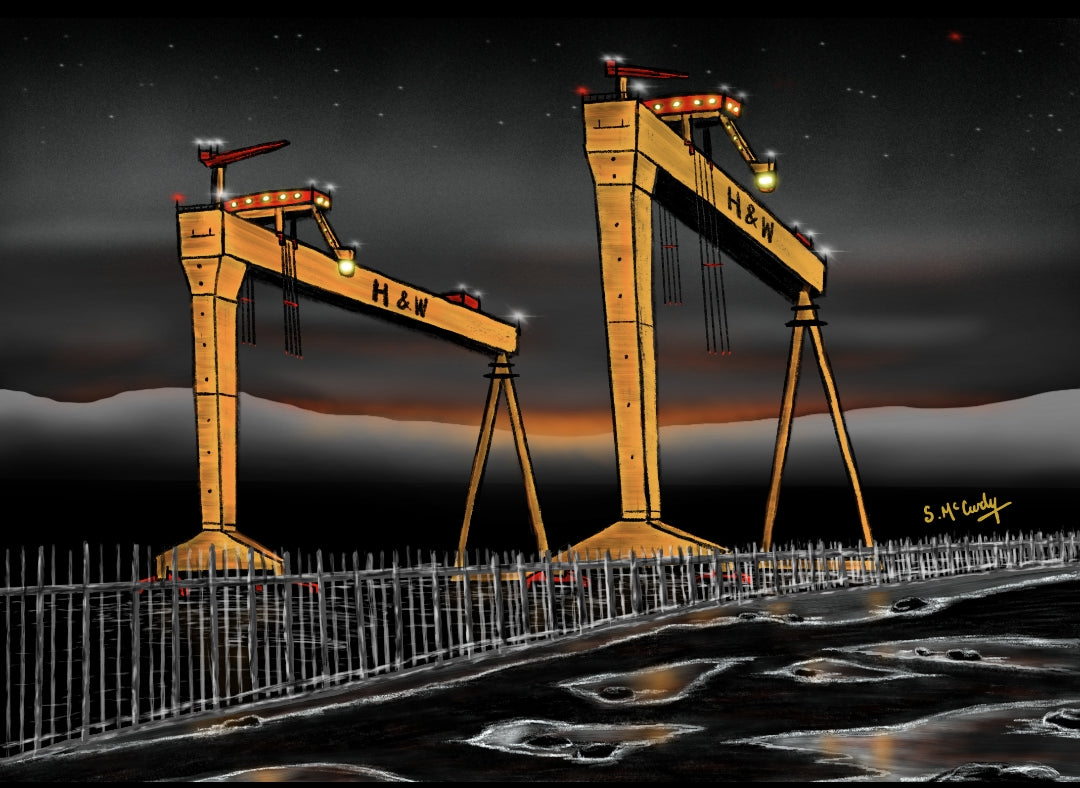 The iconic Harland and Wolff cranes of Belfast are a notable feature in much of his work.