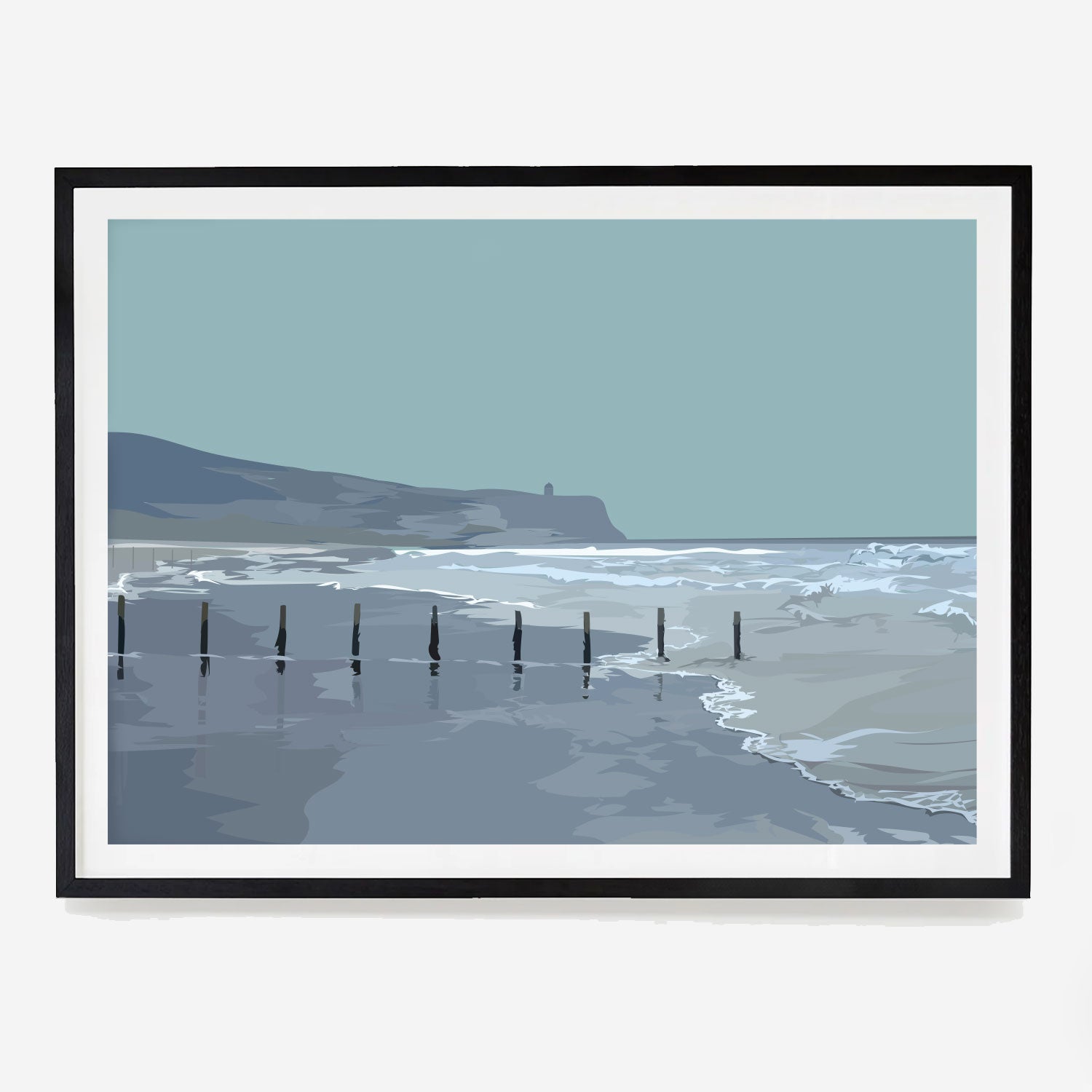 A seaside sensation! This beautiful landscape hand drawn illustration captures the tranquil and calming Portstewart Strand situated in North cost of Northern Ireland. Its composition boasts a variety of cool undertones, with soft greys and teals featuring the iconic Mussenden Temple. A gorgeous poster print that can be easily framed.