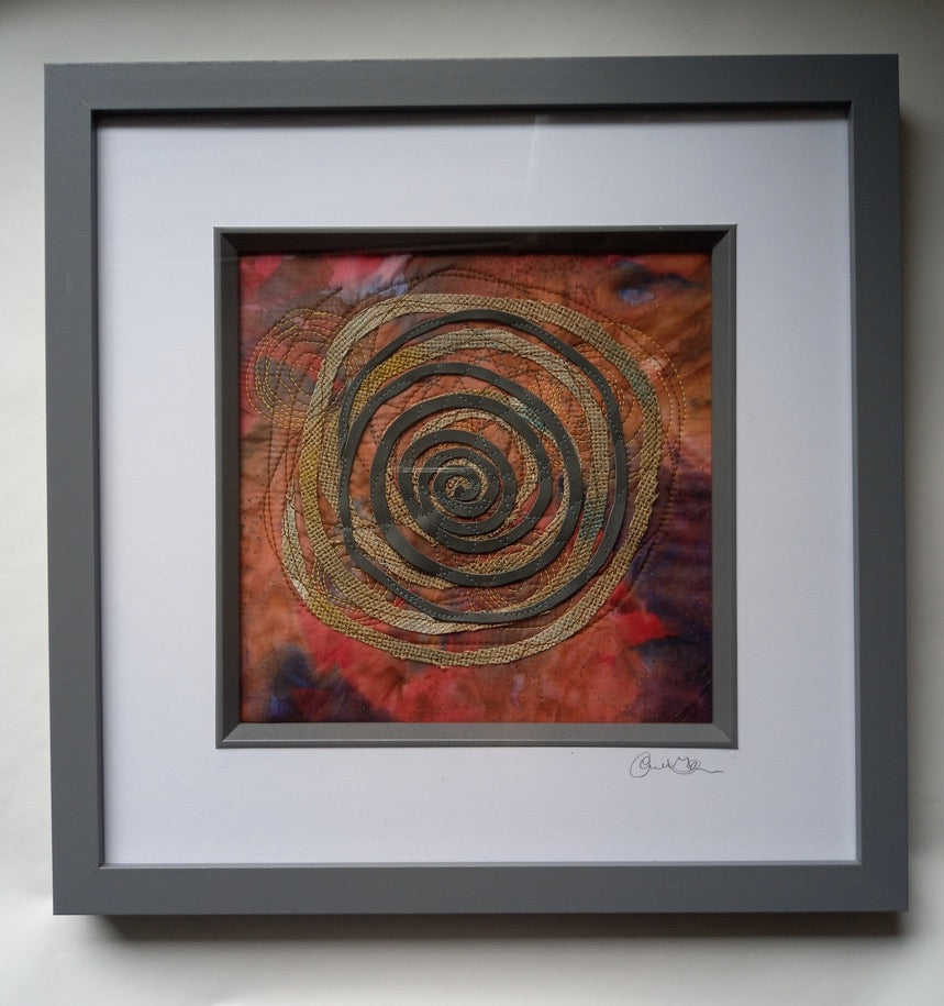 This captivating mixed media textile artwork by Carole Kane brings together the richness of texture and the serenity of nature in a harmonious composition. Featuring hand-painted silk, leather, hessian, and expressive machine embroidery, this work is layered to evoke depth and emotion.