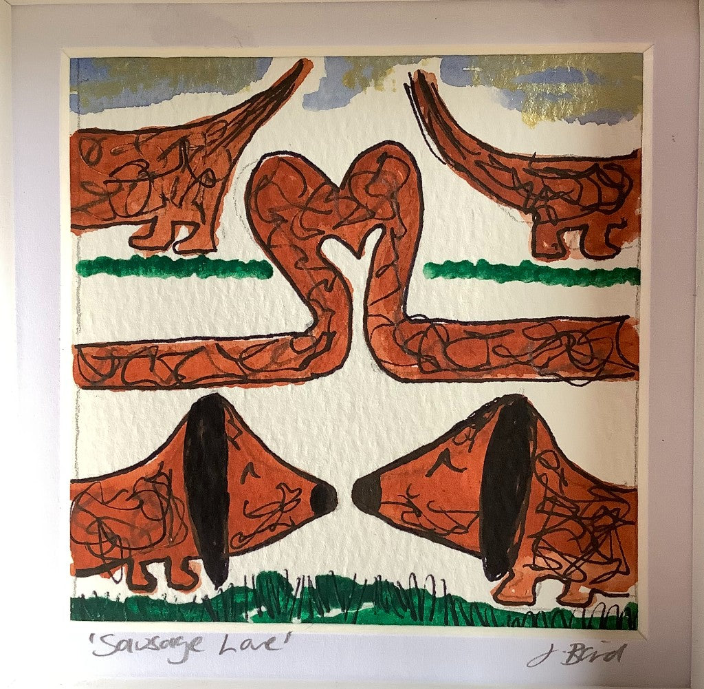 Perfect for the dog lover, ‘Sausage Love’ is an original watercolour by Jenny. Measuring 10x10cm, it comes in a black frame. This is a one-off piece.